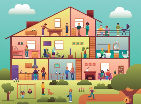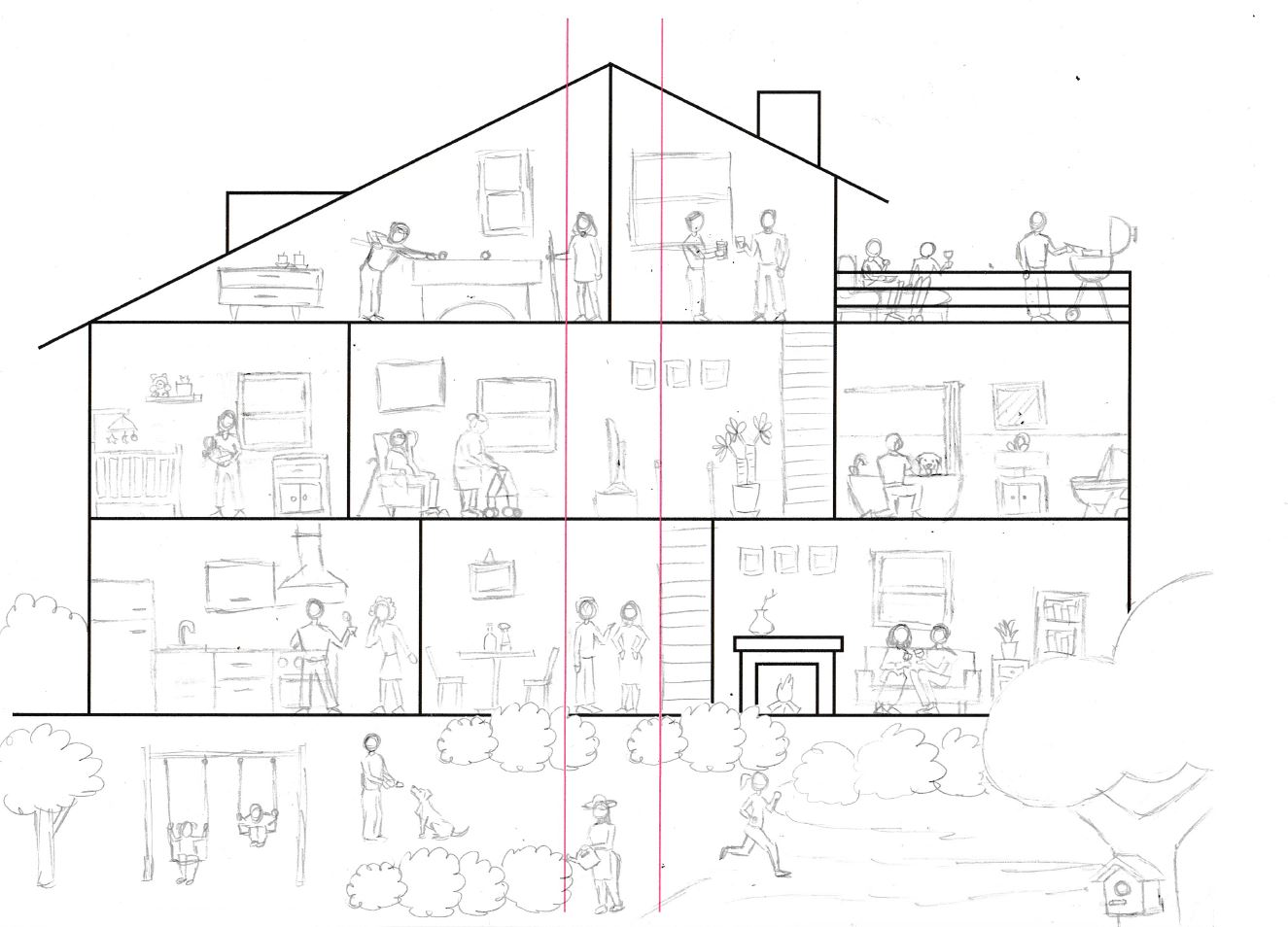 Für Zuhause anders denken, ein Sachbuch über verschiedene Arten des gemeinschaftlichen Wohnens, stand von Anfang an die Idee eines Wimmelbilds im Raum. Ein Haus mit vielen Zimmern und voller Menschen, sinnbildlich für Gemeinschaft, aber auch aufsehenerregend dadurch, dass sich viel „tut“. Für dieses Cover haben wir mit der Illustratorin Olivia Gnahn zusammengearbeitet, die das Cover von einer ersten Skizze in ein digital illustriertes Bild verwandelt hat: